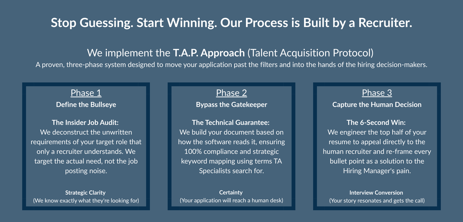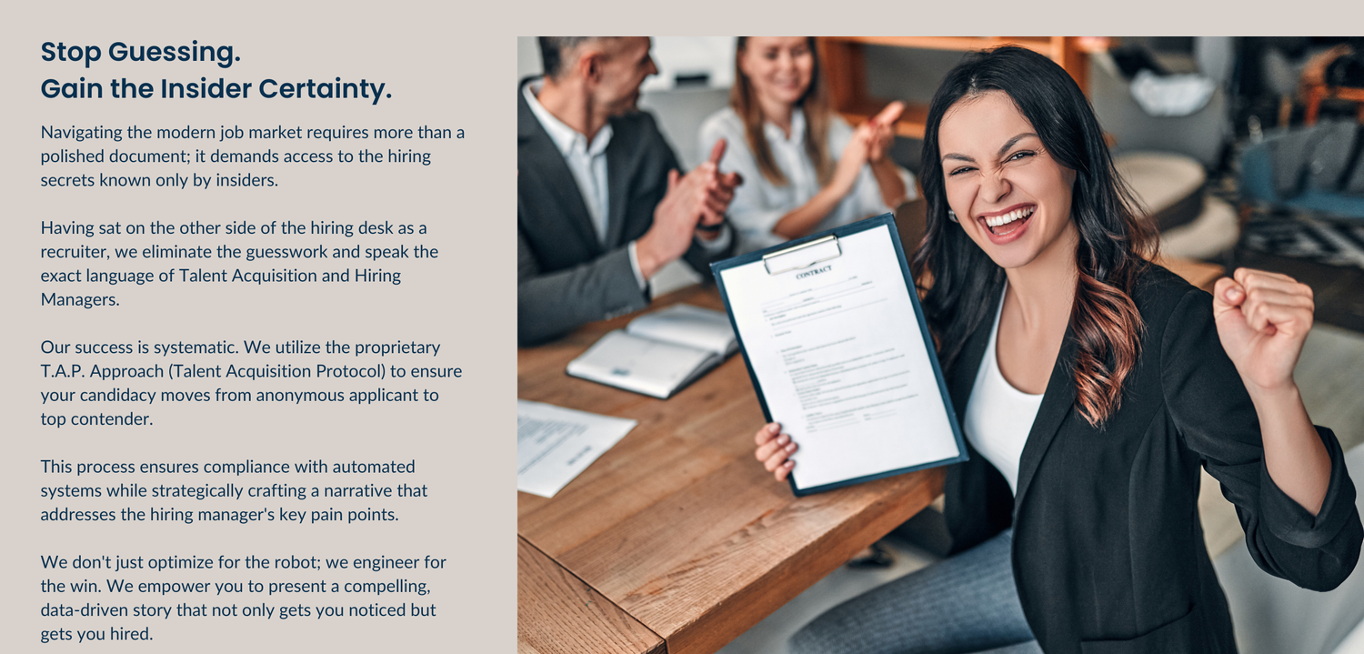 We concentrate on uncovering the engaging story that distinguishes you and makes your application stand out. This story is then strategically positioned to address the specific hiring needs we, as recruiters, look for.